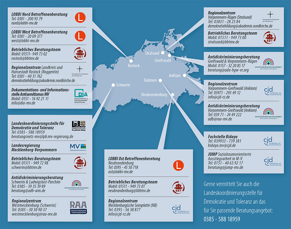 Das Betriebliche Beratungsteam Mecklenburg-Vorpommern (BBT) unterstützt alle Betriebsparteien, Auszubildende, Ehrenamtliche und Personen im Bundesfreiwilligendienst bei der Auseinandersetzung mit extrem rechten Einstellungen, Diskriminierung und Demokratiefeindlichkeit in der Arbeitswelt. Unser Ziel ist die Stärkung von Solidarität und Respekt in den Unternehmen in M-V.